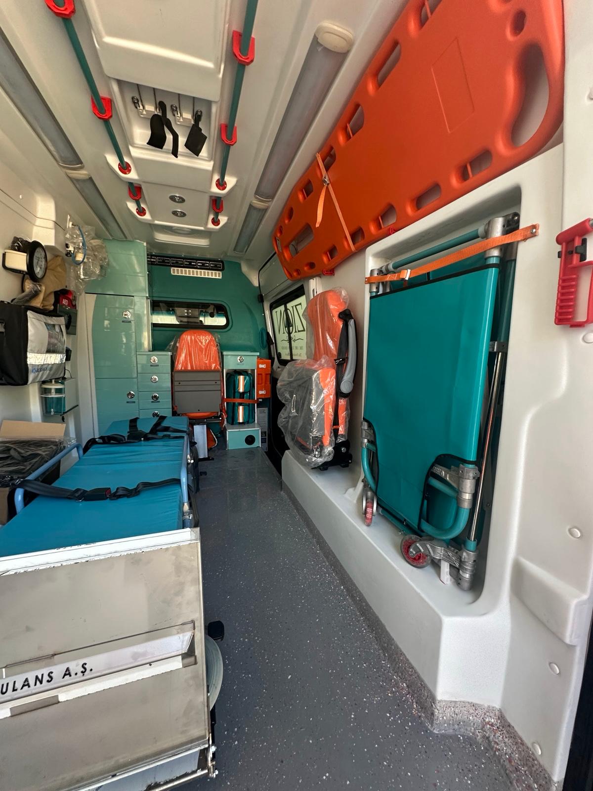 This ambulance is built in compliance with TS EN 1789 +A1 standards for road ambulances and their medical equipment. It features water insulation, antibacterial epoxy flooring, a full LED lighting system for scene safety, and essential safety tools including fire extinguishers and glass-breaking hammers.
