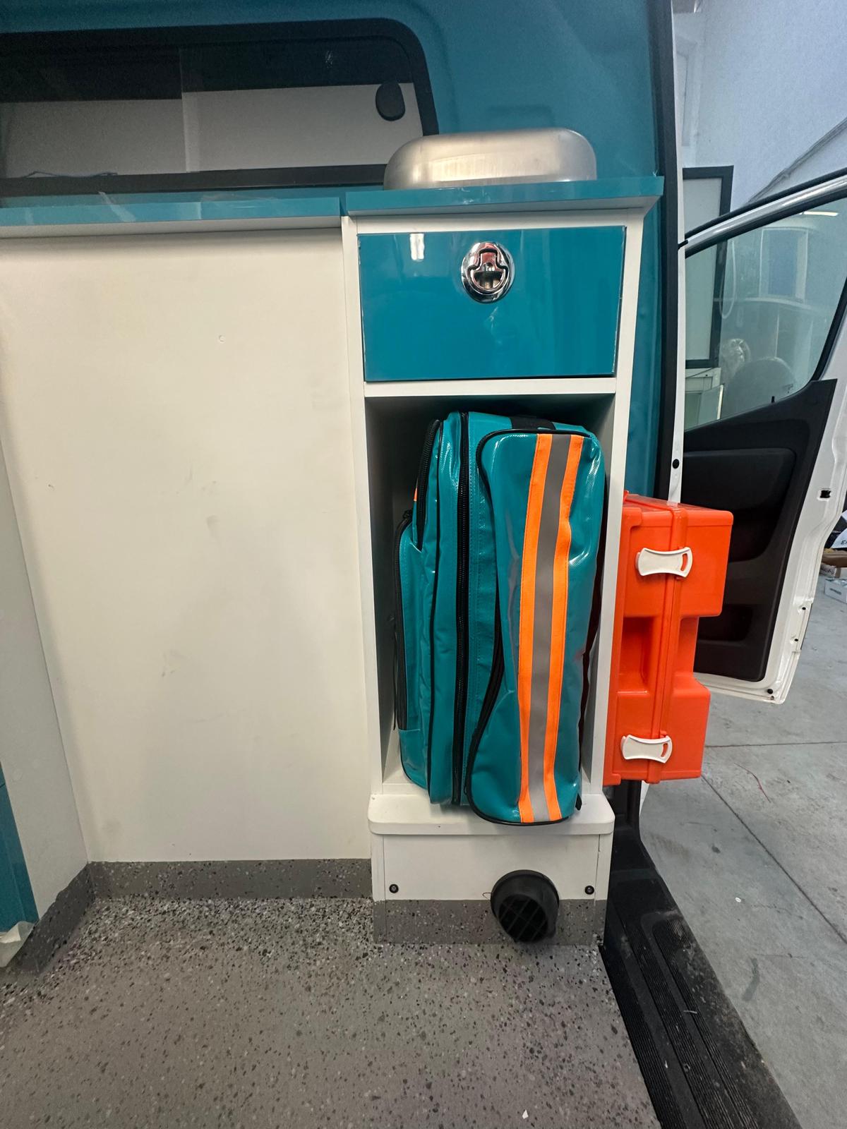 - Seating & Accessibility: Includes a foldable swivel chair (Trio system), a front doctor’s seat, and ergonomic seating platforms for the medical crew.