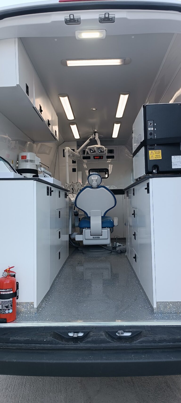 Mobile dental clinics contain all the equipment used in traditional fixed dental examinations and procedures, including: