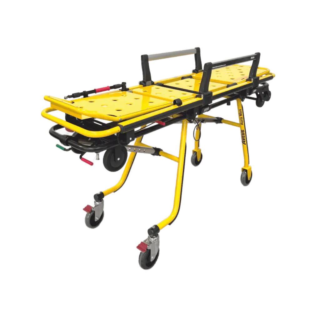 The AURA MAX by AVEUS is a durable, height-adjustable stretcher designed for safe patient transport. It features an aluminum board, adjustable backrest, foldable safety side bars, and brakes on rear wheels. With a 300 kg capacity and smooth maneuverability, it’s ideal for ambulances and emergency medical use.