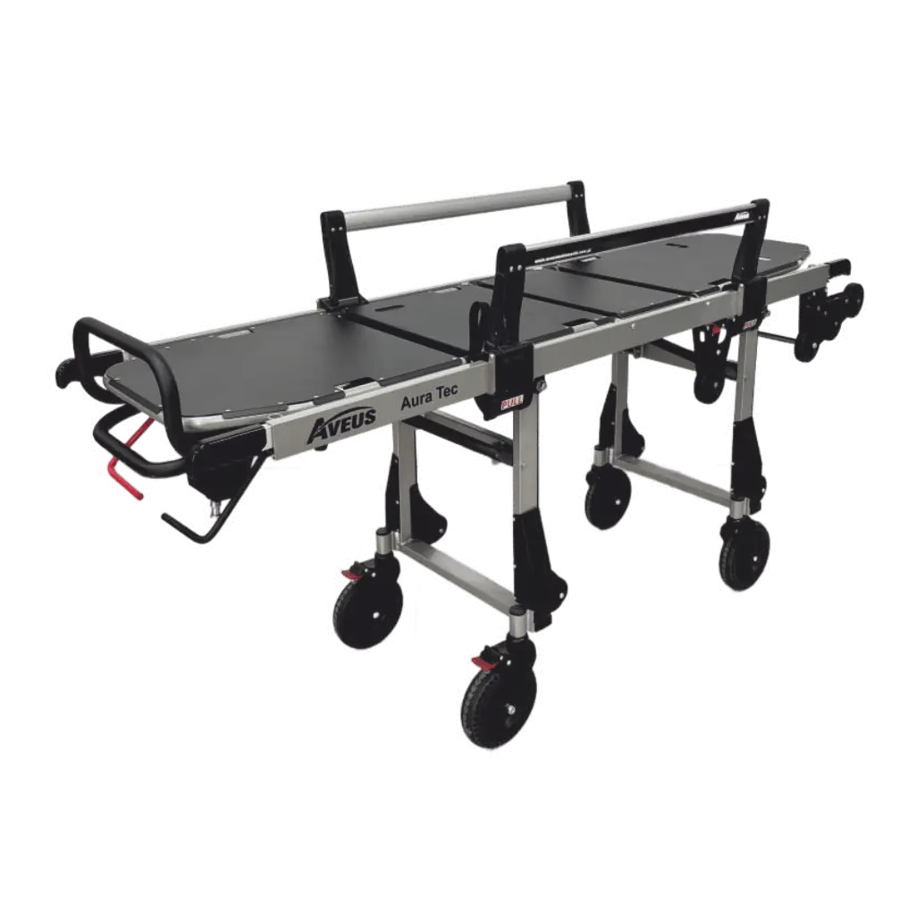 The AURA TEC by AVEUS is a durable, adjustable medical transport device with an aluminum board, safety bars, and maneuverable wheels. It features an adjustable backrest, height system, and a 350kg loading capacity, ensuring safe and efficient patient handling.