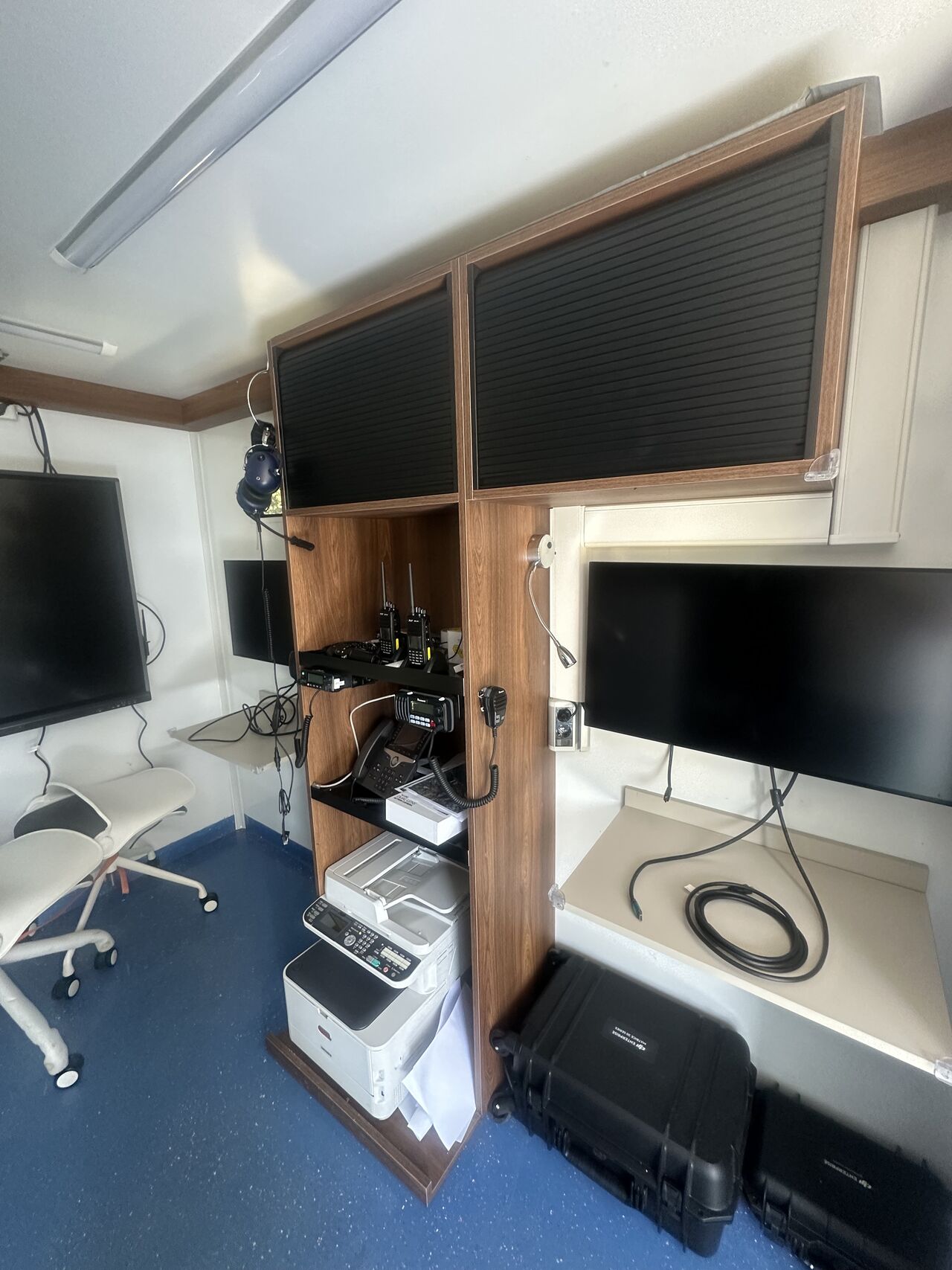 A typical military mobile command center interior is configured for maximum operational efficiency: